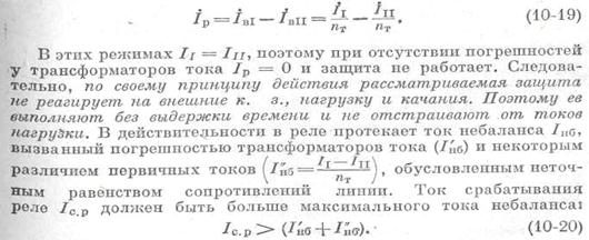 Схема защиты для одной фазы изображена на рис. 10-21. На одноименных фазах каждой линии устанавливаются трансформаторы тока с одинаковым коэффициентом трансформации nТI = nТII = пТ. Вторичные обмотки трансформаторов тока соединяются разноименными зажимами по схеме с циркуляцией токов в соединительных проводах и параллельно к ним включается обмотка токового реле 1, В нормальном режиме и при внешнем к. з.