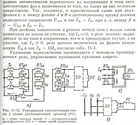Для этого каждое пусковое реле должно работать только при повреждении на определенных фазах. Такое свойство пусковых органов называется избирательностью. На рис. 11-32 показана упрощенная односистемная схема с переключениями в цепях тока и напряжения дистанционного органа защиты (РС). Эта схема применяется в защите, предназначенной для сети с малым током замыкания на землю. Для облегчения работы контактов переключающих реле.при больших токах к. з. 50—100 А токовые цепи реле РС питаются через вспомогательные понизительные трансформаторы тока ВТ (рис. 11-32). Каждый из этих трансформаторов имеет две первичные обмотки ВТф и ВТ0 и одну вторичную ВТ2. Обмотка ВТФ питается током I ф соответствующей фазы, а обмотка ВТ0 током 10, получаемым через автотрансформатор АТ0. Ток первичных обмоток I ф и ток I 0 трансформируются во вторичную обмотку ВТг, в последней появляется ток