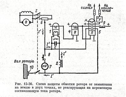 и поэтому по «Правилам электротехнических установок» при появлении одного замыкания на землю на оставленном в работе генераторе должна включаться защита от второго замыкания на землю. Обычно на станции имеется один комплект защиты, приспособленный к удобному и быстрому подсоединению его к любому генератору станции. Принцип действия защиты от второго замыкания на землю показан на рис. 15-35, б. Параллельно обмотке ротора включается потенциометр r п. На потенциометре находится точка К'1, потенциал которой равен потенциалу места первого замыкания в обмотке ротора (точка К1). Между точкой К'1 и землей включается обмотка токового реле Т. Схема представляет собой четырехплечий мостик с реле в его диагонали. При равенстве потенциалов точки повреждения К1 и точки потенциометра К'1 сопротивления плеч моста удовлетворяют условию r1/r2 = r1 п /r2 п, при этом ток в реле Т равен нулю и защита не действует. В случае появления второго замыкания на землю, например в точке К2, подобранное соотношение сопротивлений плеч моста нарушается, вследствие чего потенциалы точек К'1 и К1 становятся неравными и в диагонали моста (в реле) появляется ток, величина которого зависит от степени небаланса плеч. Если ток в реле I р > I с.р, то защита приходит в действие. Чем дальше от точки К1 возникает второе повреждение К2, тем больше будет ток в реле. Защита имеет мертвую зону, расположенную вблизи точки К1 (между точками а и б). Если второе замыкание (К2) окажется в пределах этой зоны, то ток I р будет меньше I с.р и защита не сможет действовать. Точка К'1 на потенциометре защиты находится опытным путем по милливольтметру постоянного тока, который измеряет напряжение на обмотке реле Т. Движок потенциометра передвигается до тех пор, пока показание вольтметра не станет равным нулю, что указывает на балансировку плеч и отсутствие тока I р. Принципиальная схема защиты показана на рис. 15-36. При замыкании на землю в одной точке, даже при наличии баланса плеч, через реле непрерывно протекает переменный ток I ', обусловленный неравномерностью воздушного зазора между статором и ротором. Вследствие этой неравномерности величина магнитного потока, пронизывающего обмотку ротора, пульсирует при вращении ротора. Эта пульсация потока вызывает в обмотке ротора э. д.с, обусловливающую появление переменного тока I ' в цепи реле. Под влиянием тока I ' реле может срабатывать при отсутствии второго замыкания. Для предупреждения неправильной работы защиты последовательно с обмоткой реле включается дроссель 2. Сопротивление дросселя подбирается таким образом, чтобы величина переменного тока I 'была меньше /, реле. Для постоянного тока сопротивление дросселя мало, поэтому оно не оказывает существенного влияния на величину этого тока. Для повышения надежности отстройки защиты от переменного тока I 'параллельно обмотке реле 1 включается конденсатор С, через который замыкается большая часть тока I '. При появлении второго замыкания на землю весь ток повреждения, являющийся постоянным, протекает по реле, поскольку конденсатор не пропускает постоянный ток. Обмотка реле 1 присоединяется не непосредственно на землю, а на вал ротора, поскольку замыкание обмотки происходит также но непосредственно на землю, а на корпус ротора. Для подсоединения к валу устанавливается специальная щетка 10. Защита, имеет реле в