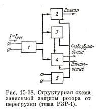 Для повышения чувствительности в КЗР-2 в качестве реагирующего органа вместо реле 1 (рис. 15-36) используются два поляризованных реле ПР1 и ПР2. Одно из них действует при токе повреждения, когда потенциал точки К1 больше К'1, а второе — при токе обратного направления, когда потенциал точки К'1 больше К1 (рис. 15-35, б). Оценка защиты. Недостатками защиты являются возможность неправильного действия ее при к. з. в цепи статора, наличие мертвой зоны и непригодность схемы в случае, если первое замыкание на землю произошло на конце обмотки ротора. Несмотря на несовершенство схемы, она имеет широкое распространение на генераторах ввиду своей простоты. Опыт эксплуатации показал, что при повреждениях в роторе рассмотренная защита действует четко. б) Защита ротора от перегрузки током Мощные турбогенераторы 100 МВт и выше с непосредственным охлаждением проводников обмоток статора и ротора имеют в отличие от генераторов малой мощности меньшую перегрузочную способность, поэтому при перегрузках ротора, когда I рот > I рот.ном, обмотка ротора мощных турбогенераторов нагревается быстрее и их тепловая характеристика t д= f (I рот) идет ниже, чем у машин малой мощности. Так, например, у небольших турбогенераторов при двукратном токе в роторе допустимое время tдоп ≥ 1 мин, в то время как для мощных машин типа ТВФ t доп = 30 с, а для ТВВ и ТГВ — 20 с (см, табл. 15-3). За такой промежуток времени (20—30 с) дежурный персонал не сможет принять необходимых мер по ликвидации перегрузки или отключению генератору. В связи с этим для мощных турбогенераторов необходима автоматически действующая защита ротора от перегрузки его током., предупреждающая повреждение изоляции обмотки ротора от чрезмерного нагрева ее повышенным током. Перегрузка ротора возникает при работе регулятора или устройства форсировки возбуждения. Максимальное значение перегрузки определяется кратностью тока форсировки возбуждения. В Советском Союзе максимальное значение тока форсировки возбуждения («потолок» возбуждения) принимается равным 2 I рот.ном. Продолжительная форсировка, опасная для ротора, может возникнуть при недостатке реактивной мощности генераторов для восстановления нормального напряжения в системе или при неисправности регулятора возбуждения генератора, вызывающей увеличение тока в роторе.