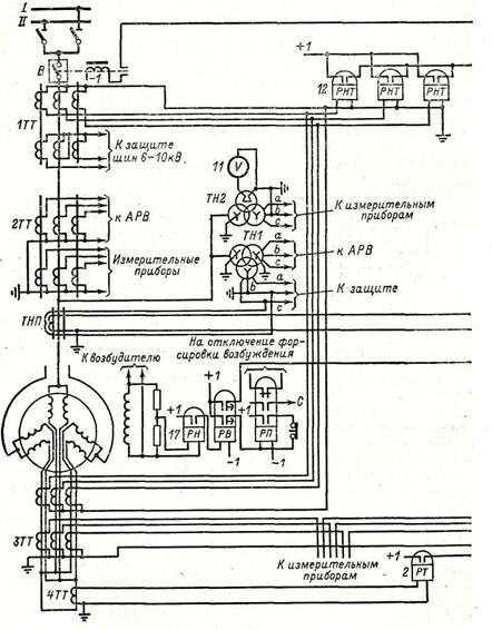 Реле 5 действует на отключение или подает сигнал о действии защиты и шунтирует обмотку реле 1, которая не рассчитана на длительный ток. Для удобного присоединения цепей защиты к поврежденному генератору устанавливается рубильник 3. Вольтметр 7 и кнопка 8 служат для настройки защиты, а кнопка 9 для деблокировки схемы после срабатывания защиты.