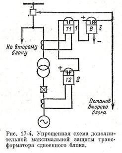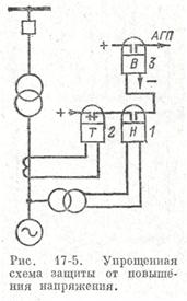 Защита выполняется в виде двухфазной токовой максимальной защиты (реле 1 и 3 на рис. 17-4). Нормально эта защита отключена, так как она может неправильно работать при перегрузках и качаниях. Защита вводится в работу автоматически в режиме, когда один из генераторов блока отключен. Эта операция выполняется с помощью токового реле 2, реагирующего на исчезновение тока в трех фазах генератора. б) Защита от повышения напряжения