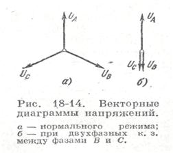 Защита минимального напряжения устанавливается на электродвигателях, которые необходимо отключать при понижении напряжения для обеспечения самозапуска о т ветственн ы х электродвигателей или самозапуск которых при восстановлении напряжения недопустим по условиям техники безопасности или особенностям технологического процесса. На электростанциях к ответственным относятся такие электродвигатели, отключение которых вызывает снижение нагрузки или остановку станции. К ним относятся электродвигатели питательных, конденсатных и циркуляционных насосов, электродвигатели дымососов, дутьевых вентиляторов и питателей пыли. Неответственными считаются электродвигатели, отключение которых не отражается на нагрузке станции, например электродвигатели мельниц на станциях с промежуточными бункерами, багерных насосов и т. п. Если мощность всех ответственных электродвигателей превышает допустимую мощность по условию самозапуска, то при понижении напряжения необходимо отключать и некоторые ответственные электродвигатели. По истечении времени, достаточного для развертывания неотключаемых электродвигателей, отключенные ответственные электродвигатели можно включать обратно при помощи АПВ. Схемы защиты минимального напряжения должны обеспечивать отключение электродвигателей как при полном исчезновении напряжения, так и при длительном коротком замыкании в сети, вызывающем торможение двигателей. Отключение электродвигателей при исчезновении напряжения обеспечивается установкой одного реле минимального напряжения, включенного на линейное напряжение (рис. 18-13). Защита с одним реле напряжения надежно реагирует на трехфазные к. з. Однако при двухфазных к. з. защита с одним реле действует только при к. з. между фазами, на которые включено реле. Так, если реле включено на напряжение Uав (рис. 18-14), то в случае замыкания между фазами В и С напряжение Uав снижается незначительно. Оно составляет 1,5 Uф, т. е. уменьшается всего на 15% номинального значения. Поскольку по условию возврата минимального напряжения уставка на нем не может быть выше 70—80% номинального напряжения сети, то защита в рассматриваемом случае действовать не будет. Такое же положение имеет место в случае к. з. между фазами А и С.