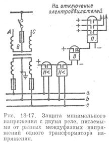 Существенным недостатком защиты минимального напряжения является возможность ее неправильной работы в случае обрыва цепей напряжения, чаще всего возникающего при перегорании предохранителей в этих цепях. Поэтому защита по схеме рис. 18-13 и 18-15 применима лишь для неответственных электродвигателей. Во избежание ложного отключения электродвигателей при обрыве цепи напряжения в ответственных установках применяются схемы с двумя комплектами реле напряжения, включенными на разные трансформаторы напряжения (рис. 18-16) или разные линейные напряжения одного и того же трансформатора напряжения (рис. 18-17).