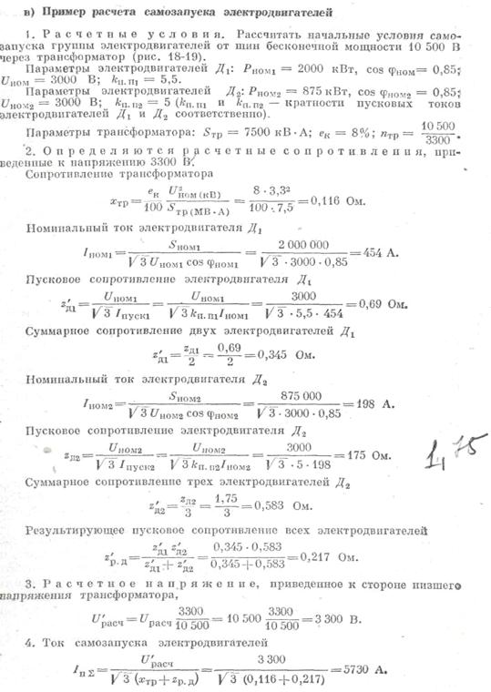 Расчет токов самозапуска электродвигателей и остаточного напряжения на их зажимаха) Общие положения Расчет самозапуска необходим для выбора уставок защит источников питания, а также для определения предельной мощности самозапускающихся электродвигателей. Задача расчета сводится к определению суммарного тока самозапуска электродвигателей IпΣ и остаточного напряжения на их зажимах Uост. Расчет самозапуска выполняется для наиболее тяжелого режима при остановленных электродвигателях (s = 1). б) Расчет самозапуска электродвигателей Ниже рассмотрен расчет самозапуска остановленных электродвигателей при питании их от шин источника «бесконечной мощности» через трансформатор или реактор. Расчет самозапуска от генератора, мощность которого соизмерима с мощностью самозапускающихся электродвигателей, более сложен. Целью расчета является определение суммарного тока двигателей и остаточного напряжения на их зажимах при самозапуске. Как было указано выше, ток в момент пуска или самозапуска отдельного электродвигателя равен току трехполюсного к. з. за сопротивлением остановленного двигателя. При самозапуске группы электродвигателей (рис. 18-19) их результирующее сопротивление zР.Д находится путем параллельного сложения сопротивлений электродвигателей, участвующих в самозапуске: