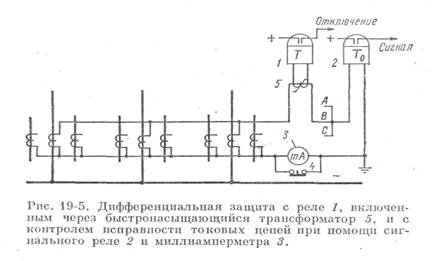 Для предупреждения неправильной работы защиты под влиянием тока нагрузки оборванной фазы дифференциальные реле отстраиваются от тока нагрузки наиболее загруженного присоединения. Кроме того, в нулевом проводе дифференциальных реле устанавливается чувствительное токовое реле 2 (рис. 19-5). При обрыве или шунтировании фазы вторичной цепи реле 2 с выдержкой времени выводит защиту из действия и подает предупредительный сигнал. Реле 2 дополняется миллиамперметром 3, при помощи которого можно обнаружить не только обрыв, но и ухудшение контакта в цепи какой-нибудь фазы или витковое замыкание в трансформаторе тока, вызывающее увеличение тока небаланса в нулевом проводе. Нажимая кнопку 4, дежурный периодически измеряет ток небаланса, проверяя, таким образом, исправность токовой цепи.
