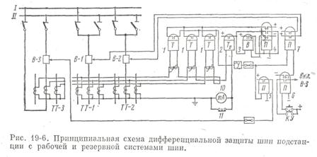 а) Схема дифференциальной защиты шин для подстанций с одной рабочей и второй резервной системами шин Подстанция, изображенная на рис. 19-6, нормально работает на одной системе шин, на которую включены все присоединения. Шиносоединительный выключатель В-3 отключен. Вторая система шин находится в резерве без напряжения. Защита шин подстанций такого типа выполняется по схеме, изображенной на рис. 19-6. Схема защиты шин должна обеспечивать отключение повреждения не только в условиях нормального режима подстанции, но и во время перевода присоединений с рабочей системы шин на резервную. При переводе присоединений обе системы шин жестко связываются шиносоединптельным выключателем В-3, образуя одно целое. В этом случае в зону действия защиты должны входить обе системы шин. Для выполнения этого условия трансформаторы тока шиносоединительного выключателя не подсоединяются к защите. В нормальном режиме шиносоединительный выключатель отключен, и поэтому неподсоединение его трансформатора тока к защите не влияет на ее работу. При включении шиносоединительного выключателя резервная система шин попадает в зону действия защиты, поэтому если в момент опробования резервных шин на них окажется к. з., то защита шин сработает и отключит всю подстанцию, в то время как в данном случае было бы достаточно отключить один шиносоединительный выключатель, сохранив в работе рабочие шины. Чтобы устранить указанный недостаток, предусматривается блокировка, которая в момент опробования резервных шин прерывает действие защиты на отключение всех присоединений, кроме шиносоединительного выключателя. Благодаря этому при опробовании защита шин может отключать только один шиносоединительный выключатель В-3.