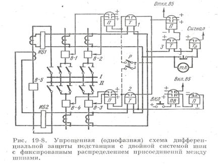 (рис. 19-7 и 19-8). Комплект реле 1 предназначается для защиты первой секции. Он включается по дифференциальной схеме на трансформаторы тока всех присоединений, закрепленных за первой системой шин, и действует на их отключение. Комплект реле 2 служит для защиты второй секции. Его реле 2 питается от дифференциально соединенных трансформаторов тока присоединений, закрепленных за второй секцией, и действует на их отключение. Комплект 3 является дифференциальной защитой обеих секций. Он включен на сумму токов, проходящих через реле комплектов 7 и 5, иоказывается, таким образом, дифференциально подключенным к трансформаторам тока всех присоединений. Комплект 3 действует при к. з. на шинах как первой, так и второй секции. Привнешних к. з. он не работает независимо от того, как распределены по системам шин присоединения. Реле комплекта 3 подают плюс оперативного тока на реле комплектов 1 и 2 и производят отключение шиносоединительного выключателя. В случае соблюдения принятой фиксации присоединений все три комплекта не работают при внешних к. з. П р и к. з. н а шинах первой секции действуют комплекты 1 и 3. Для комплекта 2 это к. з. является внешним, и поэтому он не работает. В с л у ч а е к. з. на второй системе шин комплект 1 защиты не работает. Комплекты же 3 и 2 приходят в действие и отключают все присоединения второй (поврежденной) системы шин. Анализируя поведение защиты при нарушении фиксации, например если присоединение В-2 (рис. 19-7) переведено на вторую секцию (при помощи резервной системы шин и выключателя В-7), можно установить следующее: а) при сквозном к. з. токи в комплектах 1 и 2 не балансируются, в результате чего оба комплекта могут сработать, но так как в комплекте 3 токи уравновешиваются, то он не работает и не позволяет комплектам 1 ж 2 произвести неправильные отключения; б) при к. з. на второй секции токи в комплекте 1 не балансируются, так как в этот комплект поступает избыточный ток от трансформатора тока присоединения В-2, которое включено на вторую секцию, поэтому на отключение срабатывают не только комплекты 3 и 2, но и комплект 1, в результате чего при повреждении на одной системе шин неселективно отключаются обе. Следовательно, в случае нарушения принятой фиксации присоединений по шинам рассмотренная схема сохраняет селективность при внешних к. з., но теряет ее при к. з. на шинах. Чтобы обеспечить селективность (в случае нарушения фиксации) при к. з. на шинах, следует переключить трансформаторы тока