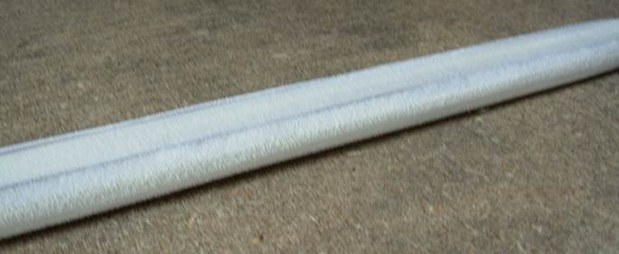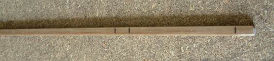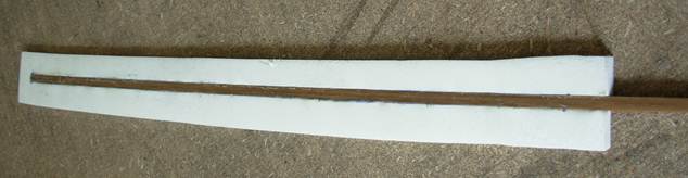 Начинаем с клинка. Для начала тщательно зачищаем наждачной бумагой все полосы пены с обеих сторон. После этого размечаем прут сердечника. От предполагаемого кончика отступаем 72,5 см, делаем отметку, отступаем 2,5 см, делаем ещё 1 отметку, и через 12 см – ещё одну.