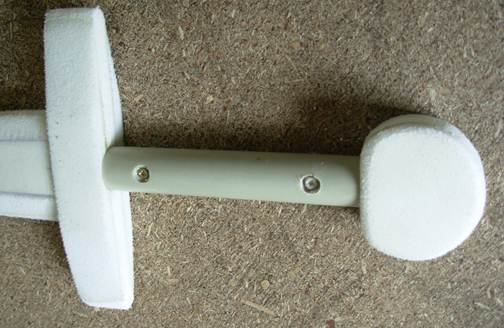 Через несколько часов наш меч полностью готов к покраске латексом. Но перед этим его ОБЯЗАТЕЛЬНО нужно пройти меч строительным феном – если этого не сделать, вся поверхность будет покрыта мерхими заусеницами и внешний вид будет изрядно испорчен. Пройдите феном по всем зашкуренным поверхностям, приглаживая торчащий ворс рукой. ОСТОРОЖНО: 1) Засовывать руку в струю фена нельзя категорически, иначе возможны ожоги. 2) Не передерживайте фен на отдельных участках, особенно на клеевых швах – они могут разойтись. 3) Попробуйте выгладить ворс рукой, после разогрева феном, сначала на каком-нибудь ненужном обрезке. Для начала подготовим место, в котором будет сушиться клинок. Это должно быть хорошо проветриваемое место в тени (ни в коем случае не под прямыми лучами солнца). Желательно подстелить что-нибудь на пол, ибо латекс с некоторых поверхностей (к примеру ковров и ковровых покрытий) отчистить крайне проблематично. Делаем из скотча петлю на рукоять, за которую мы будем подвешивать меч для сушки. Смешиваем половину банки латекса с 15-20 граммами чёрной краски. Вторую половину делим на 2 неравные части, большую из которых в отдельной посуде смешиваем с 10 граммами краски цвета «сталь», а меньшую - с 5 граммами «бронзы». Несколько общих советов по окраске: 1) Не спишите – не пытайтесь залить изделие как можно более толстым слоем. Текущие капли изрядно портят внешний вид и увеличивают расход латекса. 2) Работайте кистью длинными мазками, чтобы свести к минимуму разводы. 3) Не пытайтесь красить поверх не досохший до конца слой. Это чревато полной порчей внешнего вида изделия. Начинаем красить. Сначала наносим 5-6 слоёв латекса с чёрной краской на всё тело меча, включая гарду и яблоко. После каждого слоя тщательно промываем кисть в проточной воде, иначе к следующему слою придется брать новую. Даём каждому слою полностью просохнуть. Признаком полного высыхания слоя является исчезновение белёсых разводов – высохший латекс прозрачный. После высыхание последнего чёрного слоя наносим на клинок один за другим два-три слоя латекса с краской «сталь». При этом стараемся не попадать краской на гарду. После высыхания клинка наносим на гарду и яблоко 2-3 слоя латекса с крской «бронза». Покрываем с помощью новой кисти полностью высохший меч Finish Cover. Покрываем тщательно, стараясь не пропускать даже маленьких участков. Finish Cover увеличивает прочность наружного покрытия меча и предохраняет латекс от потери эластичности. Оставляем меч висеть на некоторое время – от 10-12 часов до несколько суток – в зависомости от разной температуры и влажности Finish Cover нужно различное время, чтобы полностью полимеризоваться.