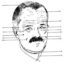 hollow cheeks; sharp ear; sleek hair; high cheekbones; to raise one’s hand; large features; piece of soap; belly; index finger; to put on weight; scent; plain; abdomen; fingertip; clear voice; ring finger; to lose one’s hair; tightly-set teeth; rumpled hair; feeble voice; prominent chin; sharp ear; grizzled hair; to brush one’s teeth; to wash one’s hair; swaying gait; squint-eyed; slender figure; firm chin; bald; apart eyes; to knit one’s eyebrows; vigorous constitution; prominent eyes; of average size; shapely arms; stumpy fingers; delicate constitution.