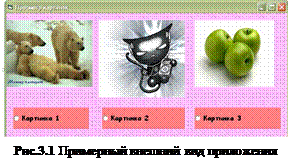 1. Создайте папку Лабораторная_работа_№3, а в ней папку 3.1. 2. Запустите программу Microsoft Visual Basic 6.0. 3. В появившемся окне выберите тип приложения STANDARD.exe и нажмите кнопку «Открыть». 4. Расположите на форме три компонента OptionButton и 3 компонента Image, свойства которых установите согласно Таблице 3.1 или ориентируясь на внешний вид приложения (Рис.3.1). Таблица 3.1 – Свойства компонентов приложения «Просмотр картинок»