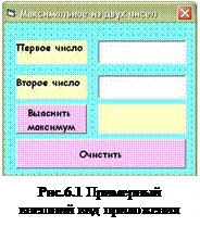 Ход работы. Составить программу, находящую максимальное число из двух чисел введенных пользователемПостановка задачи Составить программу, находящую максимальное число из двух чисел введенных пользователем. 1. Создайте папку Лабораторная_работа_№6, а в ней папку – 6.1. 2. Запустите программу Microsoft Visual Basic 6.0. 3. В появившемся окне выберите тип приложения STANDARD.exe и нажмите кнопку «Открыть». 4. Разместите на форме 2 компонента CommandButton, 3 компонента Label, 2 компонента TextBox. 5. Установите свойства компонентов в соответствии с Таблицей 6.1. Примерный внешний вид приложения приведен на Рис.6.1 Таблица 6.1 – Значения свойств компонентов приложения «Максимум»