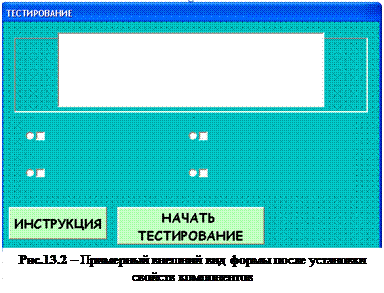 1. Создайте папку Лабораторная_работа_№13, а в ней папку 13.1. 2. Запустите программу Microsoft Visual Basic 6.0. 3. В появившемся окне выберите тип приложения STANDARD.exe и нажмите кнопку «Открыть». 4. Расположите на форме 4 компонента Option Button, 4 компонента CheckBox, 2 кнопки («Начать» и «Инструкция»), 1 компонент TextBox для задания вопросов и Label для вывода результата. Примерный вид формы – на Рис.13.2, свойства компонентов – в Таблице 13.1. Таблица 13.1 – Свойства компонентов приложения «Тест»