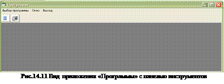 End End Sub End Sub End Sub End Sub 'Щелчок по пункту меню «Сверху вниз» Private Sub itmHorizontal_Click() Arrange vbTileHorizontal 'Щелчок по пункту «Калькулятор» Private Sub itmКалькулятор_Click() Dim newform As New frmКалькулятор Load newform newform.Show 'Щелчок по пункту меню «Фотоальбом» Private Sub itmФотоальбом_Click() Dim newform As New frmАльбом Load newform newform.Show 'Щелчок по пункту меню «Выход» Private Sub mnuExit_Click() 20. Сохраните проект 21. Запустите проект на выполнение. Первой должна активизироваться стартовая форма. 22. Проверьте функционирование всего проекта. 23. Создайте exe-файл программы с помощью команды File → Make Программы.exe. 24. Выйдите из среды Visual Basic. 25. Запустите на выполнение файл Программы.exe и убедитесь, что проект работает автономно, как любые другие Windows-приложения. Задание 2. Создание панели инструментов. Постановка задачи. Добавим в ранее созданное приложение Программы.exe панель инструментов, позволяющую открыть программу не только с помощью меню, но и с помощью кнопок управления, а также содержащую кнопки, позволяющую упорядочить окна каскадом или по горизонтали.
