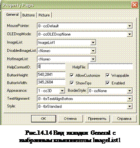 Теперь необходимо установить дополнительные элементы управления в окне ToolBox. 2. Выберите команду Project - Components 3. На вкладке Controls установите флажки у следующих компонентов: Microsoft Windows Common Controls 6.0 (SP6). В результате в окне ToolBox появится несколько дополнительных элементов, среди которых 4. Разместите элементы ToolBar и ImageList на форме. При этом ToolBar сразу «прилипнет» к верхнему краю формы (Рис.14.12). 5. Щелкните правой клавишей мыши по ImageList и выберите опцию Properties. 6. В окне Property Pages выберите вкладку Images. 7. Щелкните по кнопке Insert Picture и найдите в появившемся окне нужную папку с картинками (в нашем случае папка Images, которую Вы создали в папке с данной лабораторной работой). 8. Выбранная картинка появится в поле Images, а в поле Index появится ее порядковый номер – 1. Аналогично вставьте вторую картинку, ее индекс – 2 и т.д. (Рис.14.13). Закончив, щелкните на кнопке OK. 9. Щелкните правой клавишей мыши по расположенному на форме компоненту ToolBar. Выберите опцию Properties. 10. В открывшемся окне Property Pages выберите вкладку General (Рис.14.14). 11. В списке ImageList выберите ImageList1 (Рис.14.14). 12. Откройте вкладку Buttons (Рис.14.15). 13. Щелкните по кнопке Insert Button. В поле Index появится 1.