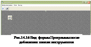 18. Проведите аналогичные действия для второй кнопки. Закончив, нажмите на кнопке OK. Вид приложения после добавления панели инструментов показан на Рис.14.16. Осталось запрограммировать работу кнопок на панели инструментов. Так как мы уже запрограммировали действия, которые должны выполняться при выборе той или иной программы в меню (Калькулятор, Альбом), то нет необходимости описывать заново программный код для панели инструментов. Для этого воспользуемся функцией Call - функцией вызова общей процедуры. 19. Щелкните два раза левой клавишей мыши на созданной панели инструментов и наберите в открывшемся окне следующий программный код (необходимые комментарии приведены в кавычках): Private Sub Toolbar1_ButtonClick(ByVal Button As MSComctlLib.Button) Select Case Button.Key 'В зависимости о того, по какой кнопке 'выполнен щелчок мышью, вызывается 'соответствующая процедура Case "Калькулятор" Call itmКалькулятор_Click 'Процедура Call вызывает выше созданную 'процедуру itmКалькулятор_Click Case "Фотоальбом" Call itmФотоальбом_Click 'Процедура Call вызывает выше созданную 'процедуру itmФотоальбом_Click
