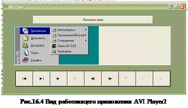 8. Запустите проект на выполнение и проверьте его функциональность 9. Закройте запущенное приложение. 10. Создайте exe-файл приложения с помощью команды File → Make AVIPlayer2.exe. 11. Выйдите из среды Visual Basic. 12. Запустите на выполнение файл AVIPlayer2.exe и убедитесь в работоспособности exe-файла. 12. Внешний вид приложения во время работы приведен на Рис.16.4.
