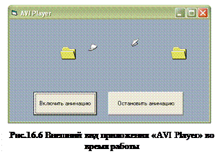 13. Сохраните проект под именем AVIPlayer3.vbp, а форму под именем frmAVIPlay.frm 14. Запустите проект на выполнение и проверьте его функциональность 15. Закройте запущенное приложение. 16. Создайте exe-файл приложения с помощью команды File → Make AVIPlayer.exe. 17. 18. Запустите на выполнение файл AVIPlayer.exe и убедитесь в работоспособности exe-файла. 13. Внешний вид приложения во время работы приведен на Рис.16.6.