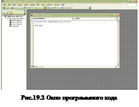 11. Выполните двойной щелчок по кнопке. Откроется окно программного кода (Рис.19.2). 12. Введите между строк процедуры следующие операторы и комментарий: Private Sub CommandButton1_Click() Dim X0, Xk, Dx, X As Double 'X0 - начальное значение X 'Xk - конечное значение X 'Dx - шаг изменения значения X 'X - аргумент X Dim i As Integer 'переменная-счетчик Set sht = Worksheets("Заполнение") 'Программное имя листа, на котором 'будут выполнены изменения sht.Range("A:D").Clear 'Очищаем столбцы на листе sht sht.Range("A1") = "N" 'Присваиваем название заголовку ячейки A1 sht.Range("B1") = "X" 'Присваиваем название заголовку ячейки B1 sht.Range("C1") = "Y" 'Присваиваем название заголовку ячейки C1 X0 = Val(InputBox("Введите значение X0:", "X0", "0")) 'запрос значения X0 Xk = Val(InputBox("Введите значение Xk:", "Xk", "0")) 'запрос значения Xk Dx = Val(InputBox("Введите значение Dx:", "Dx", "0")) 'запрос значения Dx X = X0 'Присваиваем начальное значение аргументу X i = 2 'значение индекса, указывающего номер строки, 'с которой нужно начинать заполнение Do While X <= Xk 'начинаем цикл формирования столбца значений X sht.Cells(i, 1) = i - 1 'в ячейку i 1-го столбца записываем номер строки sht.Cells(i, 2) = X 'в ячейку i 2-го столбца записываем значение X X = X + Dx 'берем следующее значение X i = i + 1 'переходим в следующую строку Loop 'конец цикла формирования столбцов № и X MsgBox "Всего в таблице " + CStr (i - 2) + " строк"
