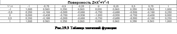 Задание 2. Построение поверхности функции Постановка задачи. Построить поверхность функции Z=X2+Y2-1. Ход работы. 1. Переименуйте Лист 3 в лист «Поверхность». 2. Объедините ячейки A1 – J1. 3. В объединенную ячейку введите название «Поверхность функции Z=X2+Y2-1». 4. В ячейке A2 введите текст «Y \ X». Это показывает, что в данном столбце A вниз располагаются значения аргумента Y, а в горизонтальной строке 2 располагаются значения аргумента X. 5. Для формирования строки значений X: - в ячейку B2 введите начальное значение аргумента X, равное «-1», в ячейку C2 – значение «-0,75»; - выделите ячейки B2 и C2; - переместите указатель мыши в правый нижний угол ячейки C2 и протяните указатель мыши до ячейки J2; ячейки должны заполниться значениями от -0,5 до 1. 6. Выполнив аналогичные действия, заполните ячейки столбца A от A3 до A7 значениями аргумента Y, изменяющегося от -1 до +1 с шагом 0,5. 7. Введите в ячейку B3 формулу: =B$2^2+$A3^2-1 Здесь используется ссылка, абсолютная по строке B, а также ссылка, абсолютная по столбцу 2. 8.