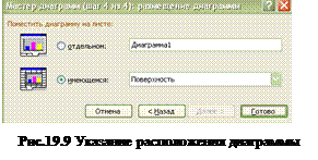 - нажмите на кнопку «Далее». 14. В следующем окне задаем подписи осей (Рис.19.7) и параметры отображения основных и дополнительных линий осей (Рис.19.8). 15. На последнем шаге указываем расположение диаграммы (На имеющемся листе) (Рис.19.9). 16.