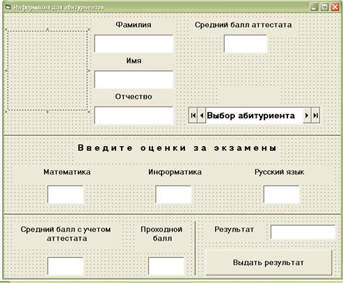 Private Sub cmdРезультат_Click() Dim sr As Single sr = (Val(txtМатематика.Text) + Val(txtИнформатика.Text) + Val(txtРусский.Text) + Val(txtСрБаллАттестата.Text)) / 4 txtСрБалл.Text = Str(sr) If Val(txtСрБалл.Text) >= Val(Проходной.Text) Then txtРезультат.Text = "Зачислен (-а)" Else txtРезультат.Text = "Не зачислен (-а)" End If End Sub