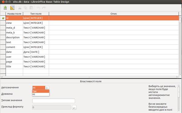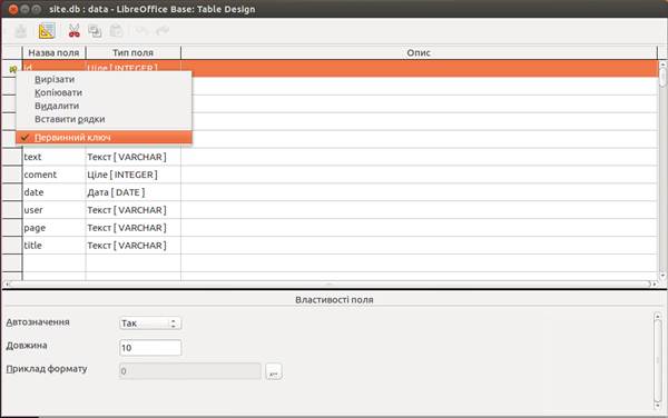 1.6 У таблиці є обовязковим одне і більше ключове поле, в даному прикладі ключове поле в нас id, щоб його зробити ключовим, достатньо клацнути зліва назви поля id, та, у даному меню, обрати рядок «Первинний ключ». Для автоматичнго збільшення ключового поля, потрібно у підменю «Властивості поля» обрати параметр «так» рядка «Автозначеня»(див. рис. нижче) Після цього нажимаємо кнопку закрити і зберегти.