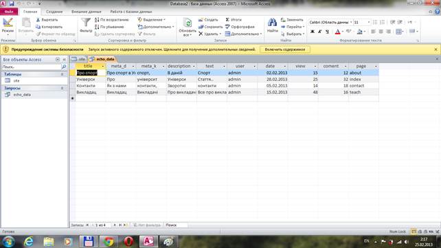 2.7 Обираємо поля для виводу, зберігаємо наш запит під назвою echo_data. 2.8 Якщо обрати наш запит, то ось так він видасть нам інформацію з нашої таблиці.