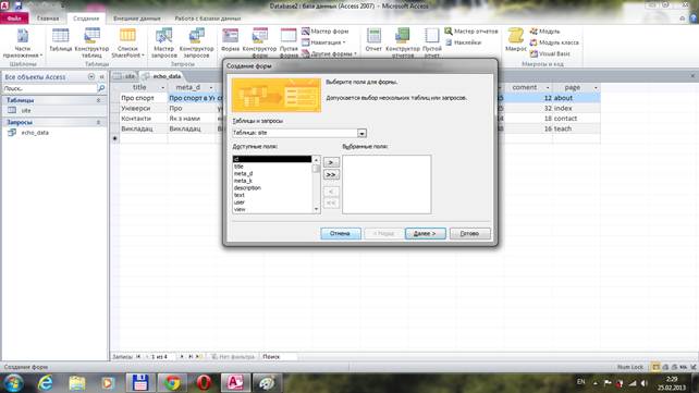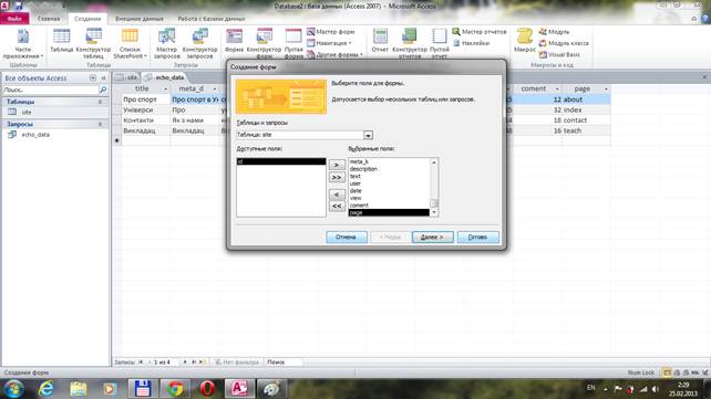 2.9 Організовуємо форму. Для цього в головному меню обераємо вкладку «Создание» і обираємо у табличці «Формы» - «Мастер форм». Бачимо вікно, яке пропонує нам обрати поля для форми, обираємо та зберігаємо.