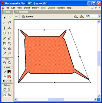 Рис. 5. Наклон объекта по вертикали Наклон объекта может быть выполнен либо путем прямого манипулирования, либо с помощью панели Transform. Чтобы наклонить объект с помощью мыши, следует выполнить следующие действия: Включить инструмент Free Transform и выбрать с его помощью требуемый объект фильма. Поместить указатель недалеко от одного из центральных маркеров и добиться того, чтобы указатель принял соответствующий вид. Нажав кнопку мыши, переместить указатель в нужном направлении. Чтобы выполнить наклон объекта с помощью панели Transform, необходимо: Выбрать требуемый объект фильма с помощью инструмента Arrow. Установить переключатель Skew (Наклон). В соответствующем текстовом поле указать угол наклона объекта (в градусах, исходному положению соответствует значение 0, 0) и нажать клавишу; для наклона по часовой стрелке cледует вводить положительные значения угла, для наклона против часовой стрелки — отрицательные. Если необходимо наклонить объект одновременно и по горизонтали и по вертикали, следует ввести требуемые значения в обоих полях, как показано на рис. 6 (клавишу следует нажимать только после указания обоих значений).