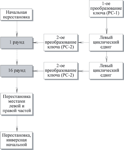 Справа на рисунке показан способ, которым используется 56-битный ключ. Первоначально ключ подается на вход функции перестановки. Затем для каждого из 16 раундов подключ Ki является комбинацией левого циклического сдвига и перестановки. Функция перестановки одна и та же для каждого раунда, но подключи Ki для каждого раунда получаются разные вследствие повторяющегося сдвига битов ключа.