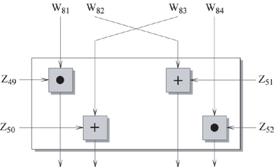 В заключении четыре выходных подблока первого преобразования комбинируются с двумя выходными подблоками МА структуры, используя XOR для создания четырех выходных подблоков данной итерации. Заметим, что два выхода, которые частично создаются вторым и третьим входами (Х2 и Х3), меняются местами для создания второго и третьего выходов (W12 и W13). Это увеличивает перемешивание битов и делает алгоритм более стойким для дифференциального криптоанализа. Рассмотрим девятый раунд алгоритма, обозначенный как заключительное преобразование. Это та же структура, что была описана выше. Единственная разница состоит в том, что второй и третий входы меняются местами. Это сделано для того, чтобы дешифрование имело ту же структуру, что и шифрование. Заметим, что девятая стадия требует только четыре входных подключа, в то время как для первых восьми стадий для каждой из них необходимо шесть входных подключей.