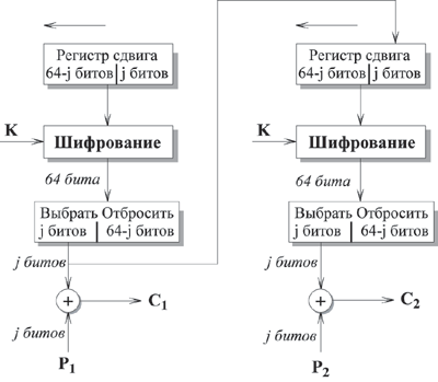 Основное преимущество режима OFB состоит в том, что если при передаче произошла ошибка, то она не распространяется на следующие зашифрованные блоки, и тем самым сохраняется возможность дешифрования последующих блоков. Например, если появляется ошибочный бит в Сi, то это приведет только к невозможности дешифрования этого блока и получения Рi. Дальнейшая последовательность блоков будет расшифрована корректно. При использовании режима CFB Сi подается в качестве входа в регистр и, следовательно, является причиной последующего искажения потока. Недостаток OFB в том, что он более уязвим к атакам модификации потока сообщений, чем CFB.