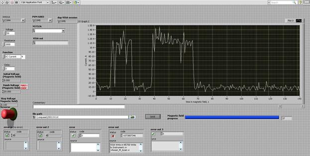 Рис. 7. Экспериментальная установка для исследования электронных свойств системы ферромагнетик-полимер в слабом магнитном поле. При исследовании применялись следующие приборы: 1. Вольтметр Agilent 34401A 61/2 Digit Multimeter, 2. Источник питания для приставки Gw Instek PSM – 6003, 3. Источник питания для магнита Agilent Technologies N 5752A 600v/1,3A. 780w. Глава 3. ЭКСПЕРИМЕНТАЛЬНЫЕ РЕЗУЛЬТАТЫ Результаты были автоматически обработаны на компьютере в программе LabView. На рисунке 8 показан фоновый сигнал для оценки электрических шумов измерительной установки. Можно сделать вывод, что шумы являются небольшими и не препятствуют получению результата.