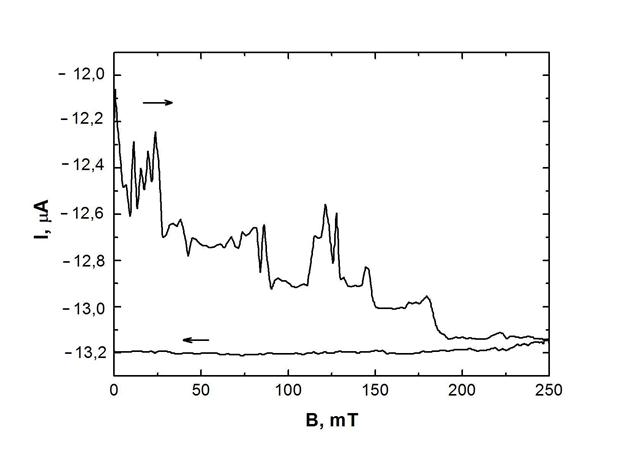 Рис. 10. Зависимость тока, протекающего через структуру Ni/ ПДФ/ Cu от внешнего магнитного поля. Магнитное поле параллельно плоскости образца. На рисунке 10 показаны результаты измерения сопротивления для системы никель/полимер/медь при изменении внешнего магнитного поля. Внешнее механическое давление присутствует. Магнитное поле направлено параллельно плоскости структуры. Переключение проводимости на никелевой подложке происходит при значении давления, близком к порогу переключения по давлению. На рисунке 11 показаны результаты измерения сопротивления для системы никель/полимер/медь при изменении внешнего магнитного поля. Внешнее механическое давление отсутствует. Магнитное поле направлено параллельно плоскости структуры. Переключение проводимости на никелевой подложке происходит при значении подаваемого электрического напряжения, близком к порогу переключения по напряжению.