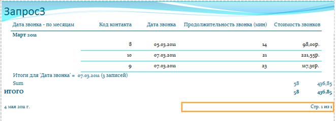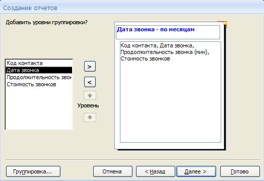 Рис. 1. Задание способа группировки данных в отчете 5. Нажмите кнопку Далее в этом окне. 6. Определите порядок сортировки данных для каждой группы. Здесь никаких изменений вносить не будем. В этом же окне можно подсчитать итоги и внести их в отчете. Для этого нажмите кнопку Итоги и в открывшемся окне задайте итоговые параметры, например, Sum, для поля Продолжительность звонка (мин) и Стоимость звонков. После активизации кнопки ОК произойдёт возврат в окно сортировки данных. Нажмите кнопку Далее. 7. На экране появится окно задания макета для отчета. Выберите макет отчёта (ступенчатый, блок или структура) и ориентацию – книжную или альбомную и нажмите кнопку Далее. 8. Задайте стиль отчета (например, Поток) и перейдите к окну, в котором надо указать имя отчета. После этого щелкните по кнопке Готово. Отчет, полученный с помощью мастера отчетов, представляет собой промежуточный документ, который подлежит корректировке и редактированию с целью придания ему окончательного вида (рис.2).
