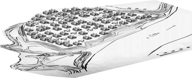 На данной стадии реконструкции на схеме располагается 21 домашнее хозяйство, 9 производственных помещений и площадок. Наложенные в масштабе на территорию города, они занимают лишь одну третью часть всей обвалованной площади. Таким образом, наш расчёт в первом приближении (64 домашних хозяйства) почти совпадает с детальной реконструкцией. Для того, чтобы расширить реконструкцию, требуется учесть особенности городского строительства. Это наличие улиц, центральной площади и достаточное расстояние между домами. Далее мы моделируем центральную улицу, идущую с севера на юг от предполагаемых ворот до площади, и расходящиеся от площади улицы. Теперь мы получили реконструкцию четвёртого уровня достоверности (Рис.13), которая, тем не менее, содержит в себе ценнейшую информацию о возможной численности города.