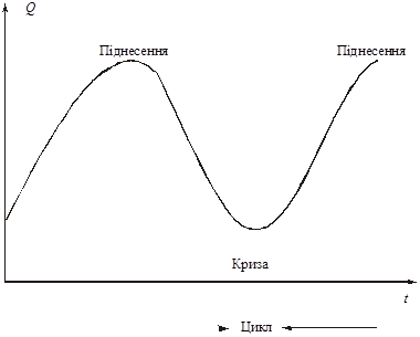 Рис. 2.2. Рушійні сили інноваційного розвитку Інноваційний розвиток має циклічний характер. В економічній літературі визнання циклічності розвитку — поширений факт, про що свідчать численні публікації [20, 31, 51, 57, 73, 90, 99, 101]. Циклічність розглядається як загальна форма руху світового господарства і національних господарств, що виражає нерівномірність функціонування різних елементів національного господарства, зміну еволюційних та біфуркаційних стадій його розвитку. Ідеться про неперервне коливання ділової активності, зльоти і падіння ринкової кон’юнктури, чергування екстенсивного та інтенсивного типів економічного зростання. Циклічність — це рух від однієї макроекономічної рівноваги в масштабах щонайменше національної економіки до другої. Епіцентром циклічного руху є криза, у якій поєднуються межа та імпульс зростання економіки. Криза утворює вихідну базу для нових капіталовкладень і нововведень, спонукаючи до оновлення на базі нової техніки, яка здатна не лише відтворити докризовий рівень прибутку, а й забезпечити вищий його рівень. На рис. 2.3 графічно показано економічний цикл, який являє собою інтервал розвитку в часі, протягом якого відбувається піднесення виробництва, розквіт, а потім його скорочення, застій (депресія), пожвавлення і знову піднесення. На графіку крайні точки розвитку фіксують піднесення і кризу.