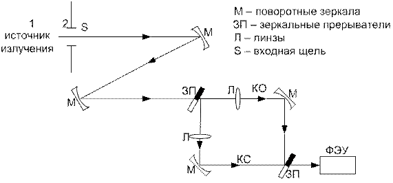 энергия прямопропорциональна волновому числу. Принципиальная оптическая схема спектрофотометра "Specord UV-VIS" приведена на рис.21. В качестве источника света в ультрафиолетовой области спектра используется дейтериевая лампа, в видимой - лампа накаливания. Световой пучок попадает на входную щель монохроматора, откуда монохроматический пучок направляется на зеркальный прерыватель, где он разделяется на два потока, образующие канал измерения и канал сравнения. На приемник излучения, в качестве которого используется сурьмяно-цезиевый фотоумножитель, падает свет то из канала образца, то из канала сравнения. Регистрация спектров производится пером на специальном бланке. В конструкции спектрофотометра предусмотрены различные параметры регистрации. В настоящий момент на приборе установлены: масштаб волнового числа-12.5мм/1000 см-1; время регистрации спектра - 4.4 мин/лист; скорость регистрации-5000 см-1/мин.