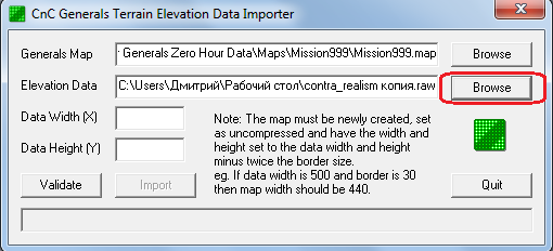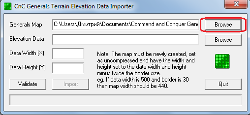А теперь о том, как это сделать. Нам понадобится: картинка, фотошоп или аналог, редактор генералов и, конечно, сам ELEVATOR. 1.Сначала картинка красится в серый цвет (черно-белый), выбирается размер, соответствующий карте, и сохраняется в формате.RAW. 2. Затем создается карта в генералах (пустая!) с размером, совпадающим с картинкой. Земля за границей тоже учитывается! В пункте ‘Edit’-‘Edit Map Settings’ изменяется вкладка ‘Compression’ с ‘RefPack’ на ‘No Compression’. Карту сохраняете, название запоминаете.
