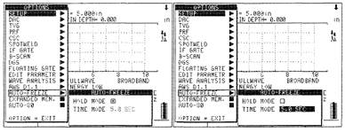 Программная опция Auto-Freeze позволяет дефектоскопу EPOCH 4 замораживать изображение на специфический период времени, когда сигнал превышает уровень строб-импульса на экране дисплея. Это достигается использованием тревожных сигнализаций по превышению порогового уровня строб-импульса (Gate Alarm), которые уже запрограммированы в приборе. Эта опция имеется в списке меню Options.