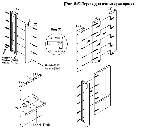 D) Болтами (M6*23) соедините части собранные по пунктам A) и B). (См. рис. 8-6) E) Щиты купе кабины (1) ~ (4) собранные по пункту D) установите на плинтус пола и временно закрепите болтами (M6*23). (См. рис. 8-7) F) Установите нижний конец левой стойки портала двери в положение края дверного проёма и закрепите её к полу болтом (M6, 1). G) Установите правую сторону стены кабины, метод сборки такой же как A) ~ F).