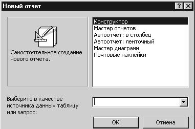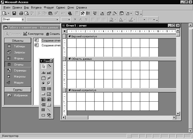Мал.1. Вид вікна Новый отчет Для створення звіту у вікні бази даних вибираємо пункт Отчет у списку кнопки, Открыть новый об'єкт на панелі інструментів, чи кнопки Создать на вкладці Отчеты. Access виведе на екран вікно діалогу Новый отчет, представлене на Мал.1. Access показує ім'я обраного джерела в поле зі списком у нижній частині вікна діалогу. 6.1.1. Вибір майстра по розробці звітів У вікні діалогу Новый отчет можна вибрати один із шести варіантів. · Конструктор - дозволяє створювати звіт «з нуля» і редагувати вже створений звіт. · Мастер отчетов - запускає основного майстра для створення звітів, що дозволяє вибрати поля для звіту, задати формати, умови угруповання і підсумкові функції. · Автоотчет: в столбец - цей майстер створює звіт, у якому кожен запис базового запиту чи таблиці представлений у виді простого списку, що містить назви і значення полів. · Автоотчет: линейный -у звіті цього типу дані записи базового запиту чи таблиці виводяться в одному рядку. Якщо таблиці базового запиту зв'язані відношенням «один-ко-многим», то майстер створює групу для даних, що надходять з боку відносини «один», але не обчислює ніяких підсумкових значень. При створенні звіту використовується останній стиль, що був обраний у майстру звітів чи застосований за допомогою автоформату в конструкторі звітів. · Мастер диаграмм - цей майстер допомагає побудувати діаграму і створює в звіті вільну рамку об'єкта OLE із упровадженою діаграмою Microsoft Graph. · Почтовые наклейки - цей майстер дозволяє вибрати поля з іменами й адресами, форматувати їх і створити звіт для друку поштових наклейок. Ви можете вибрати будь-який тип і настроїти розмір наклейок. 6.1.2. Розділи звіту при використанні Конструктора отчета Порожній макет звіту містить розділи Верхний колонтитул, Нижний колонтитул, між якими знаходиться Область данных. Додати чи видалити верхній і нижній колонтитули можна за допомогою команди Вид ® Колонтитулы. При створенні звіту можна задати заголовок, що буде надрукований тільки на самому початку звіту, і примітку, що буде надрукована наприкінці звіту. Щоб додати в звіт ці розділи, виберіть команду Лінійка з розподілами по верхньому і лівому краях вікна звіту допомагають планувати розташування даних на сторінці. Змінити розмір будь-якого відділу можна, перетягнувши його границю. У кожнім розділі Access виводить сітку. 6.1.3. Вікно звіту і його інструменти Панель елементів містить усі кнопки для всіх елементів керування, які можна використовувати при створенні звіту. Це поля, написи, малюнки, прапорці і т.д. Щоб відкрити цю панель потрібно вибрати команду Вид – Панель элементов, або клацнути на кнопці Панель элементов на панелі інструментів. Кнопка Другие элементы надає доступ до всіх елементів керування Active (у тому числі до елемента керування Календарь) встановленим у системі. Щоб розмістити в звіті конкретний елемент керування, клацніть на відповідній кнопці на панелі елементів, натисніть кнопку миші, протягнете покажчик миші до того місця, де повинний бути елемент, і відпустите кнопку. Список полів спрощує розміщення в звіті приєднаних елементів керування (елементів керування, зв'язаних з полями таблиці чи запиту). Він відкривається щигликом на кнопці Список полей на панелі інструментів чи вибором команди Вид4Список полей. У рядку заголовка списку полів Access вивод