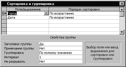 У першому рядку стовпця Поле/выражение розкривається список полів базової чи таблиці запиту. Почавши введення зі знака рівності (=), можна ввести в цьому стовпці вираження, що містить посилання на будь-яке поле базової таблиці чи запиту. За замовчуванням Access сортує значення по зростанню. Для зміни порядку сортування виберіть значення По убыванию в списку, що розкривається, що з'являється після щиглика в осередку стовпця Порядок сортировки. У звіті повинне бути зарезервоване місце для заголовка кожної групи і примітки, у якому можуть виводитися підсумкові поля. Щоб додати в звіт ці розділи, установите для властивостей Заголовок группы і Признак группы значення Да. Крім того, можна попросити Access виводити всі детальні дані для даного рівня угруповання на одній сторінці (якщо це можливо), вибравши для тієї ж властивості значення Вся група. 6.2.2. Завдання діапазонів угруповання. Для кожного поля чи вираження, заданого у верхній частині вікна сортування й угруповання, можна установити властивості Группировка та Интервал. Звичайно дані групуються за кожним значенням поля чи вираження. Але записи можна групувати не тільки за окремим значенням, але і по діапазонах значень. Вид і розмір діапазону залежать від типу даних поля чи вираження. При угрупованні по текстовому полю можна починати нову групу при зміні першого чи декількох початкових символів значення поля. Наприклад, щоб утворити по одній групі для кожної букви алфавіту, визначите створення нової групи при зміні першої букви значення поля – таким чином, ви одержите групу записів, у яких значення поля починається з букви А, групу записів зі значенням поля, що починається з букви Б, і т.д. Щоб задати угруповання по перших символах, установите для властивості Группировка значення По первым знакам, а в осередку властивості Интервал уведіть число початкових символів, по яких ви хочете утворювати групи. Для чисел можна установити властивість Группировка в значення Интервал. У цьому випадку властивість Интервал визначає діапазони угруповання. Access обчислює діапазони, починаючи з 0. Якщо задати інтервал, рівний 10, то будуть формуватися групи значень від –20 до –11, від –10 до –1, від 0 до 9, від 10 до 19, від 20 до 29 і т.д. Для полів дати/времени можна установити як значення властивості Группировка так і одиниці виміру як По годам, По кварталам, По месяцам, По суткам, По дням, По часам, По минутам. Для властивості Интервал укажіть число одиниць виміру, якщо ви хочете проводити угруповання по визначеному відрізку часу. Наприклад, якщо ви хочете створити групи з інтервалом у два роки, установите для властивості Группировка значення По годам, а в осередку властивості Интервал уведіть 2.