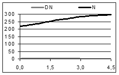 Рис. 4.13 Таким чином, приходимо до висновку, що рівновага системи при максимальній швидкості відлову є нестійкою. 4. З’ясуємо, нарешті, що буде відбуватись за умови с < сmах. Обчислимо згідно (8) значення параметра с, що має забезпечити рівноважний стан. Отримаємо с 1 = (5 – 0.01·200)·200 = 600; с 2 =(5 – 0.01·300)·300 = 600. 4.1. Перевіримо наявність рівноваги для N 0 = N 1 = 200, і N 0 = N 2 = 300 при с = 600. Уведемо по черзі ці значення до умови і, переглядаючи таблицю або відповідні графіки (рис. 4.14), переконуємося в тому, що обидва рази виникає рівновага.