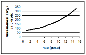 Рис. 6.3(б). З цією метою виконайте вправу. Вправа 1. Після стовпця H (перед стовпцем I) створіть новий стовпець. Він стане стовпцем I, а колишній стовпець I стане тепер стовпцем K. 2. В комірку I3 уведіть формули (вирази) для обчислення відношень загальної чисельності популяції Σ Nij попереднього й наступного років (=H2/H3). Скопіюйте цю формулу вниз в інші вільні клітинки нового стовпця. 3. Збільшіть у новому стовпці розрядність до п’яти десяткових знаків та перегляньте результати. 5. Зверніть увагу на коливання величини Σ Nij, а також відношень H i / H i +1 на початковій стадії еволюції (у перші кілька років). 6. Побудуйте графік залежності Σ Nij = Σ Nij (i), як це показано на рис. 6.3(в). Зверніть увагу на час моделювання.
