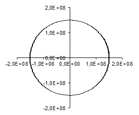 Рис. 8.16(а) Враховуючи, що в досліджуваній моделі формули для прискорень ах і ау, а також для першої космічної швидкості v І K модифіковані, слід розглядати рис. 8.16 (б) як тест на перевірку цих формул при звичайному значенні k = 2,0 . Рис. 8.16(б) Поклавши k = 1,5 і D t = 0,05 с, отримуємо схожий результат. Можна переконатися в тому, що формально колова траєкторія існує для будь-яких значень k. Зокрема, при k = 1 слід було б узяти D t» 0,0005 с, а при k = 2,2 D t» 50 і т.д. Висновок про існування Таким чином, модель перестає адекватно описувати досліджуване явище. Такі занадто великі значення v І к ми маємо сприймати лише як результати обчислень за наведеною формулою і ні в якому разі не приписувати об’єкту властивості неадекватної моделі. Знов виконаємо тестування. Показник степеня залишимо з попереднім значенням k = 2, проте збільшимо орбітальну швидкість То ж збільшимо попереднє значення vy (0), наприклад, в 1,25 =(H2*H4/H6^(H7-1))^0,5 *1,25. (11) Результат показаний на рис. 8.17(а, б).