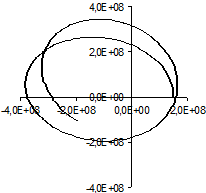 Рис. 8.20 Однак такі випадки виняткові, і при довільному значенні кут D j не є раціональною частиною від 2 p. Тому в загальному випадку траєкторія фінітного руху не замкнута. Вона нескінчену кількість разів проходить через мінімальну і максимальну відстань (як, наприклад, на рис. 8.20) і за достатньо тривалий час заповнює все кільце між двома граничними колами. Висновки 1. Якщо тіло рухається під дією сили всесвітнього тяжіння, то траєкторією його руху в залежності від початкових умов є одна з кривих другого порядку – еліпс, гіпербола чи парабола. 2. Закон всесвітнього тяжіння не тільки узагальнив, але й багато в чому уточнив Закони Кеплера, що описують рухи планет. Тут і розмаїття орбіт, і поняття про космічні швидкості, і залежність періоду обертання космічного об’єкту від суми мас обох тіл – центрального і супутника тощо. 3. Засобами обчислювального експерименту та вивчення фотографій ми впевнились у тому, що це закон дійсно всесвітнього 4. Багато задач про рухи тіл під дією змінних сил можуть бути розв’язані наближено з достатньо високою точністю за допомогою чисельного методу, коли застосування аналітичних методів виявляється за різних причин непридатним. Саме тому ми так наполегливо опановували елементи чисельного аналізу. 5. Останнє дослідження (k ¹ 2) показує, що єдиним методом, який дозволяє усунути ускладнення, пов’язані з обмеженим математичним апаратом школярів, є дослідження комп’ютерних моделей на основі чисельних методів.