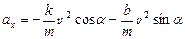 Уводячи позначення R = k/m і Q = b/m, будемо мати ax = – v 2(R cos a + Q sіn a) (1) ay = – g + v 2(Q cos a – R sіn a) (2)